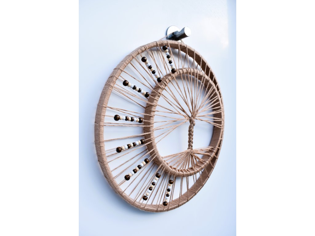 Lapač snů s peříčky, tmavě hnědými, světle dřevěnými a bílými korálky a třemi kolečky. Uprostřed...