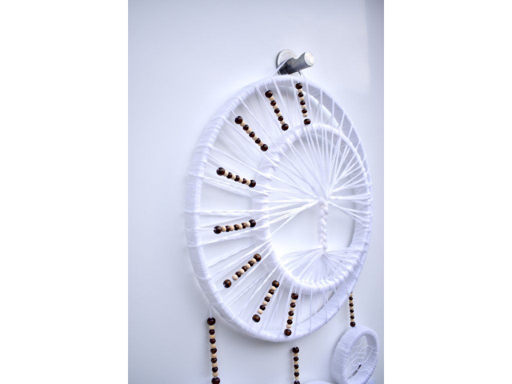 Lapač snů s peříčky, tmavě hnědými a dřevěnými korálky a čtyřmi kolečky. Uprostřed největšího kola se nachází strom života.