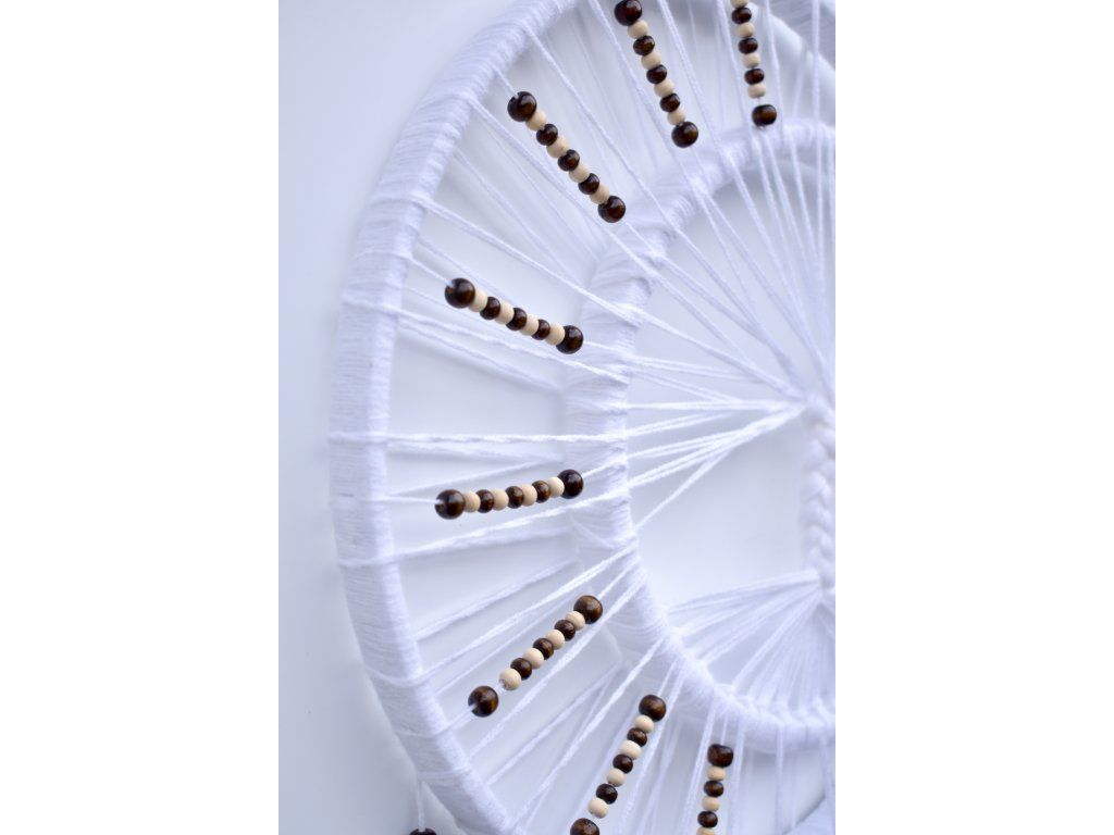 Lapač snů s bílými bambulkami, hnědými, tmavě hnědými a světle dřevěnými korálky. Uprostřed...