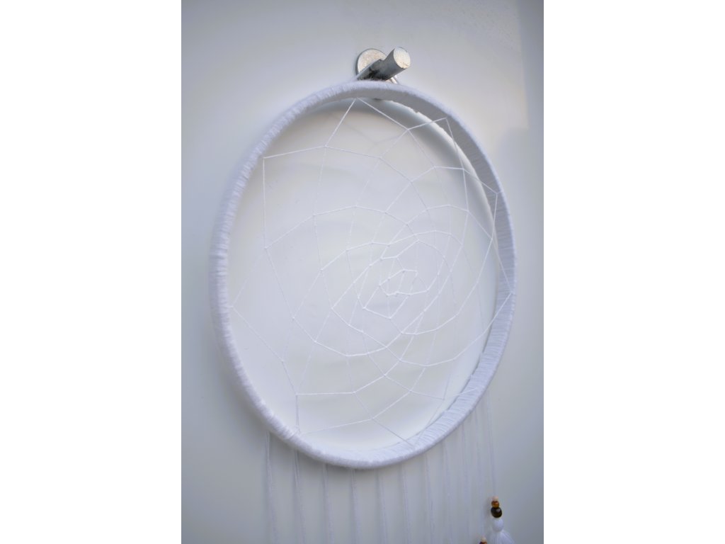 Lapač snů s bílými bambulkami, hnědými, tmavě hnědými a světle dřevěnými korálky. Uprostřed největšího kola se nachází pavučina.