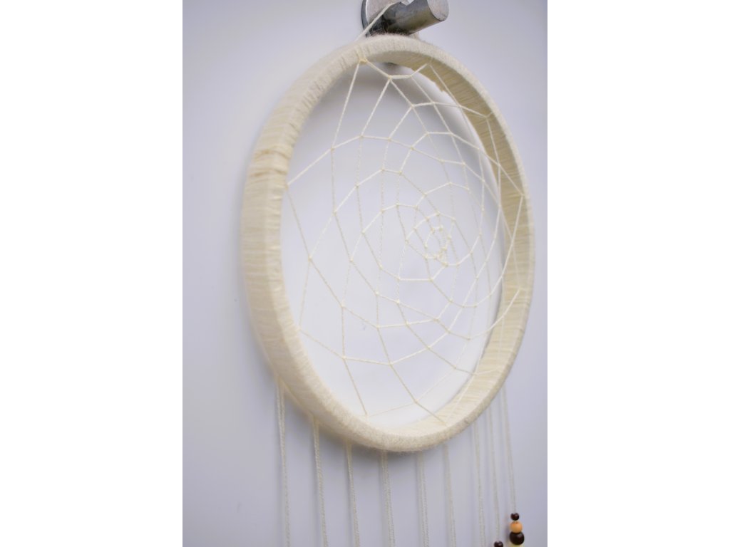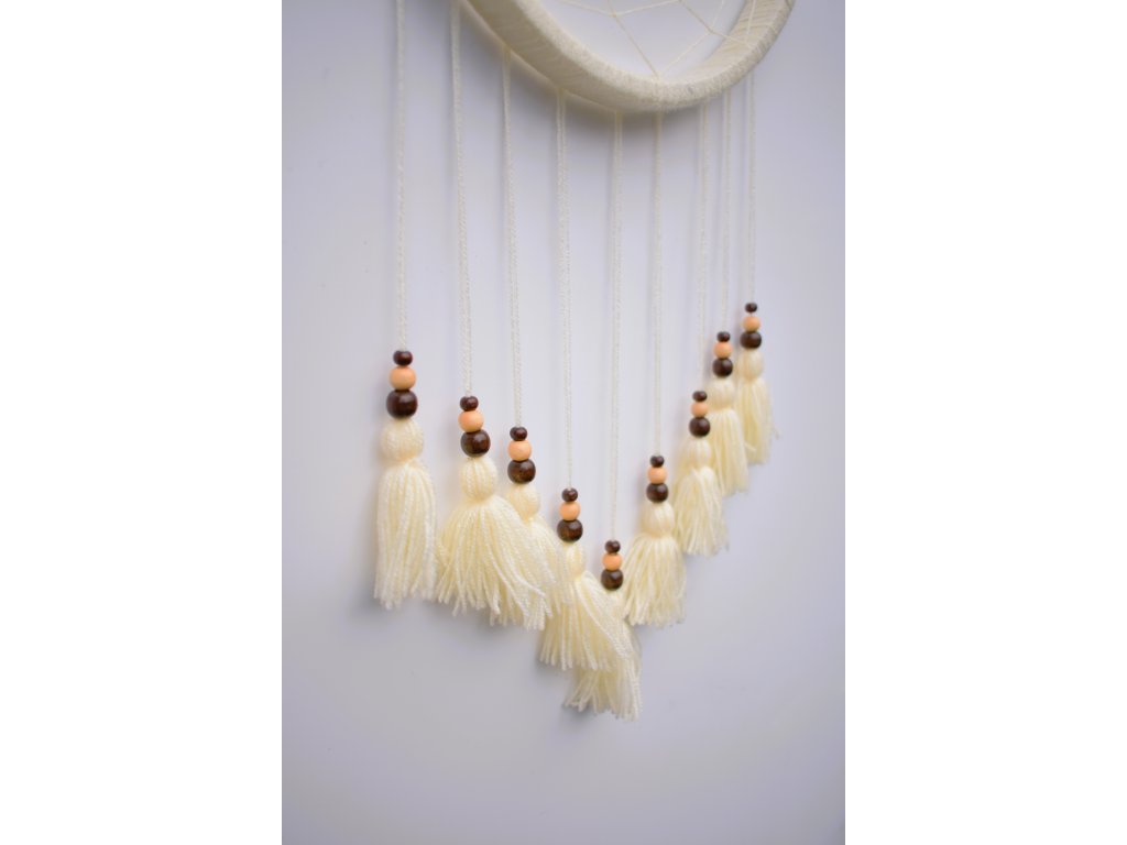 Lapač snů se smetanovými bambulkami, hnědými a světle dřevěnými korálky. Uprostřed největšího kola se nachází pavučina.