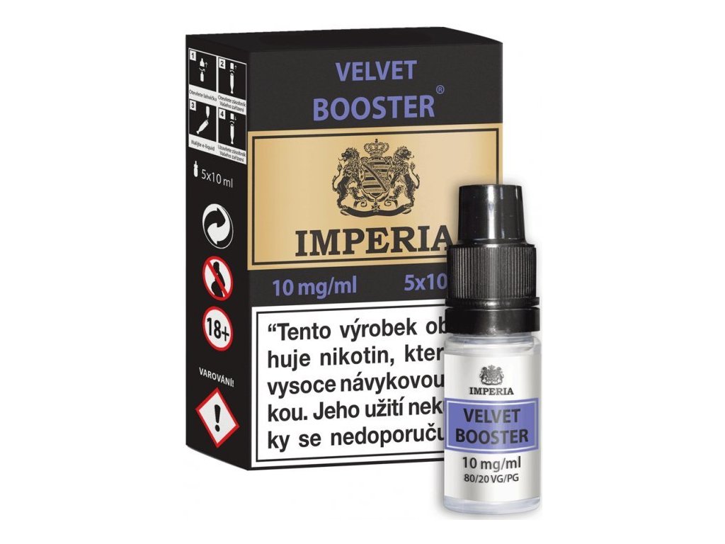 10ml Velvet Booster s koncentrací nikotinu 10mg. Určeno pro obohacení bez nikotinové báze (např. 100ml bez nikotinové báze tím získá požadovanou koncentraci nikotinu)