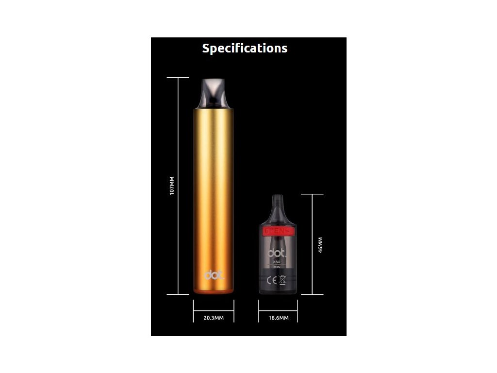 Elektronická cigareta DotMod Switch R je ideální vapovací zařízení ve stylu pera pro začátečníky, kteří hledají jednoduchost bez kompromisů v kvalitě vapingu. Tělo baterie je vyrobeno z kvalitního hliníku a disponuje vestavěným monočlánkem o kapacitě 1000mAh s rychlonabíjením typu USB-C a automatickým výkonem až 25W. Vyměnitelná cartridge (POD) je vybavena žhavící hlavou o odporu 0,8ohm s objemem nádržky 3ml. Díky magnetickému propojení s baterií lze cartridge jednoduše vyjmout a doplnit oblíbeným liquidem. Regulace přívodu vzduchu pro nastavení optimální kouřivosti se nachází ve spodní části těla baterie.