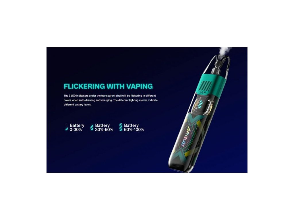 Elektronická cigareta VOOPOO ARGUS P1s Vás zaujme svým futuristickým designem, rychlým USB-C nabíjením (100% za pouhých 20 minut) a stylovým LED indikátorem stavu nabití. Vestavěný monočlánek o kapacitě 800mAh společně se speciální technologií ITO pro MTL vaping poskytuje stabilní chuť s nastavením výkonu 5W-25W a prodlužuje tím tak životnost spirálky. Vyměnitelnou cartridge (ARGUS POD) o objemu 2ml pohodlně naplníte díky jednoduchému bočnímu plnění. Na výběr máte mezi cartridgemi s vestavěnou žhavicí hlavou nebo cartridgí s vyměnitelnou žhavící hlavou ITO-M. Cartridge disponuje 4-otvorovým spodním přívodem vzduchu a společně s důmyslnou regulací přívodu vzduchu na boční straně baterie zajišťují skvělou dýmivost a autentickou chuť liquidu.