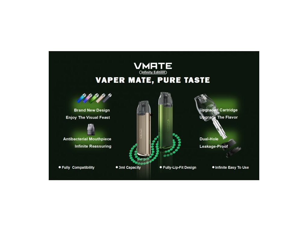Antibakteriální náustek, technologie ITO (mesh žhavící síťka) a vylepšená konstrukce proti nechtěnému úniku liquidu s duálním přívodem vzduchu, to je nová elektronická cigareta VOOPOO VMATE Infinity. Odlehčené tělo baterie disponuje vestavěným monočlánkem o kapacitě 900mAh, automatickým spínačem, USB-C nabíjecím portem a výkonem až 17W. Vyměnitelné cartridge (POD) o objemu 3ml nabízí oblíbený odpor 0,7ohm pro MTL vapování.