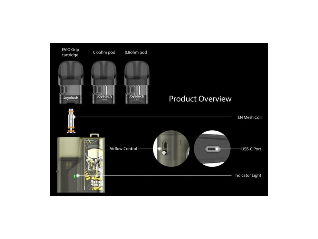 Joyetech EVIO Grip je stylový a vysoce kvalitní Pod systém, který je vhodný jak pro úplné začátečníky, tak i pro zkušené vapery. Futuristický design těla baterie obsahuje monočlánek o kapacitě 1000mAh, LED indikátor stavu nabití, automatický výkon až 20W, inovativní regulaci přívodu vzduchu a rychlé nabíjení pomocí USB-C portu. Vyměnitelná cartridge (POD) s vestavěným atomizerem o odporu 0,6ohm a 0,8ohm pojme až 2,8ml liquidu. K dispozici je také cartridge s vyměnitelným atomizerem řady EN.