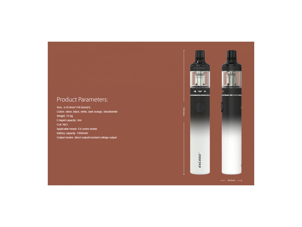 Elektronická cigareta Exceed D19 přináší pohodlné vapování s režimy konstantního a výstupního napětí. Tradiční tvar baterie představuje novinku v podobě horního LED indikátoru stavu nabití baterie (viz foto). Clearomizer Exceed o průměru 19mm spolupracuje s atomizery řady EX, které přinášejí dokonalou souhru autentické chuti liquidu a velké kouřivosti. Využívá systém horního plnění - po odšroubování vrchní části plníte liquid přímo do těla clearomizeru o objemu 2ml. Žhavicí hlavy EX nabízí dva odpory 0.5Ω (přímé potahování) a 1.2Ω pro ústa-plíce. Celý clearomizer je plně rozebíratelný = snadná údržba. Regulace přívodu vzduchu pro nastavení optimální kouřivosti se nachází ve spodní části.
