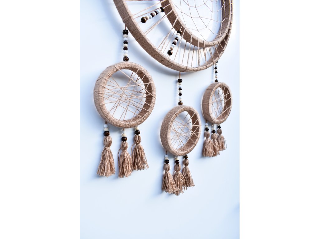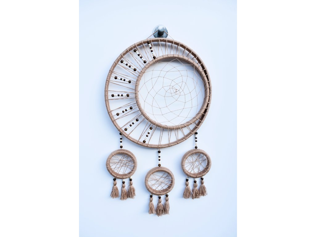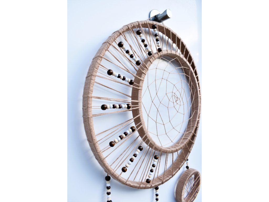 Lapač snů s měděnými bambulky, tmavě hnědými, světle dřevěnými a bílými korálky a třemi kolečky. Uprostřed největšího kola se nachází pavučina.