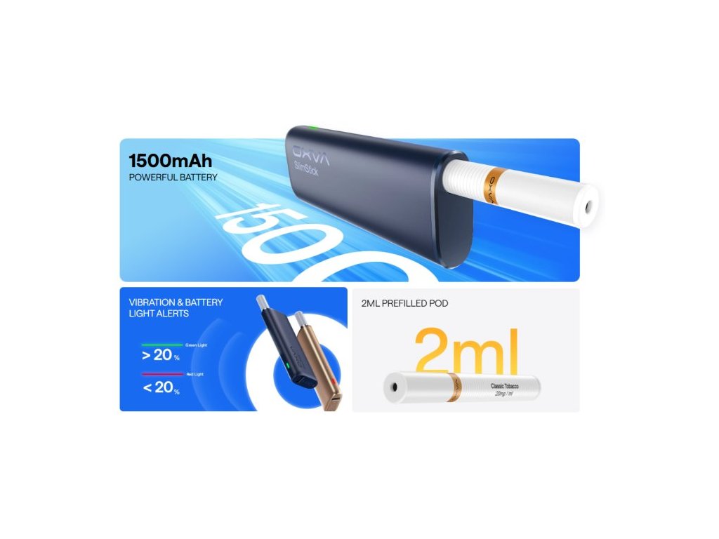 SLIMSTICK je kompaktní a výkonná elektronická cigareta s předplněnou cartridgí o objemu 2ml. Odlehčené tělo baterie disponuje vestavěným monočlánkem o kapacitě 1500mAh a LED indikátorem stavu nabití. Předplněné cartridge OXVA SLIMSTICK obsahují 2ml prvotřídního eliquidu a jsou přizpůsobeny pro MTL vapování = stejný princip jako při kouření klasických cigaret. E-liquid o síle 20mg obsahuje nikotinovou sůl, díky které dochází k rychlejší a kvalitnější vstřebatelnosti = bez dráždivého pocitu v krku oproti klasickým liquidům. Nedílnou součástí cartridge je spirálka Mesh pro rychlejší žhavení, rovnoměrné odpařování, vynikající chuť liquidu a větší tvorbu páry. Poměr 50VG/50PG