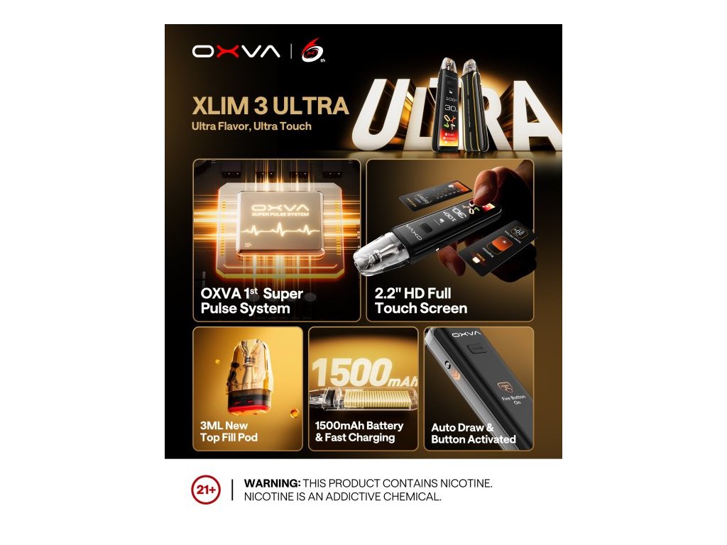 OXVA XLIM 3 ULTRA posouvá pod systémy na vyšší úroveň díky kombinaci prémiového zpracování, výkonného čipsetu a pokročilého uživatelského rozhraní. Vysokokapacitní baterie 1500mAh podporuje rychlé USB-C nabíjení (5V/2A) a technologie Super Pulse zajišťuje konzistentní chuť i při dlouhém používání a nízkém stavu baterie. Zařízení tak poskytuje stabilní výkon až do 30W a okamžitou reakci při každém potahu. Dominantou XLIM 3 ULTRA je výrazný 2.2" Full HD dotykový displej s jemností 331 PPI a 60Hz obnovovací frekvencí. Ovládání probíhá intuitivně přímo přes obrazovku, včetně změny výkonu, přepínání motivů, sledování statistik a dalších funkcí, které běžné pod systémy v této kategorii nenabízejí. Moderní grafika a animace dodávají zařízení prémiový charakter. Součástí balení jsou nové cartridge XLIM TOP-FILL s objemem 3ml, které zajišťují méně časté doplňování a delší životnost. Zařízení je kompatibilní s širokou škálou odporů (0.4Ω – 1.2Ω), což umožňuje hladký přechod mezi utaženým MTL a vzdušnějším RDL stylem. Boční regulace airflow umožňuje detailní doladění potahu podle preferencí uživatele. Díky Unitech 2.0 multi-layer technologii podávají XLIM cartridge čistou, intenzivní a dlouhotrvající chuť. Tělo ze zinkové slitiny a PCTG poskytuje vynikající odolnost, pevnost a příjemné držení v ruce. Hmotnost kolem 90 g dodává zařízení stabilnější a robustnější charakter, který ocení uživatelé hledající prémiový pocit z vapování. XLIM 3 ULTRA představuje ideální volbu pro ty, kteří hledají špičkový výkon, moderní rozhraní, dotykové ovládání a univerzální použití v jednom kompaktním zařízení. Díky spolehlivosti, rychlosti a propracovanému designu patří mezi nejpokročilejší pod systémy ve své kategorii.