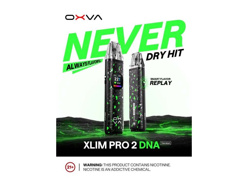 Prémiový pod systém OXVA XLIM PRO 2 DNA je postavený na pokročilém čipu EVOLV DNA, který je v komunitě pokročilých vaperů považován za technologický standard v oblasti přesnosti, bezpečnosti a uživatelské kontroly. Tento čip je vybaven technologií Replay, která umožňuje „zapamatovat si“ ideální potah a následně ho přesně opakovat – čímž zajišťuje konzistentní chuť při každém použití. Zároveň obsahuje systém ochrany proti dry hitu – čip analyzuje stav spirálky až 30 000 krát za sekundu a včas upraví výkon tak, aby nedošlo k připálení vaty ani při nízké hladině e-liquidu. Výsledkem je nejen lepší chuťový zážitek, ale i delší životnost cartridge. Tělo zařízení z luxusního kovaného karbonu a zinkové slitiny nejen skvěle vypadá, ale také vydrží každodenní používání. Baterie s kapacitou 1300mAh podporuje výstupní výkon až 30W a ve spojení s rychlým nabíjením přes USB-C (5V/2A) je ideální pro celodenní provoz bez zbytečných prostojů. Vapování je maximálně přizpůsobitelné – zařízení nabízí automatické i tlačítkové spouštění, boční regulaci airflow a k tomu 0,56´´ barevný displej, na kterém máš všechny údaje přehledně zobrazené. Pokročilejší uživatelé navíc ocení možnost plného přizpůsobení výkonových křivek a parametrů přes Evolv Escribe software na PC.
