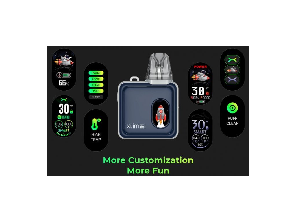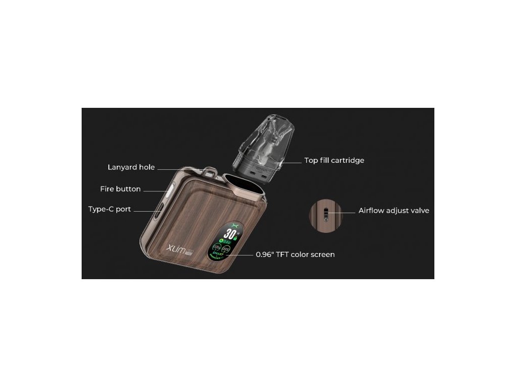 Elektronická cigareta OXVA Xlim SQ Pro je zárukou pro dokonalý vaping! Moderně zpracované tělo baterie je pokryto technologií IML (In Mold Labeling) = vícevrstvá fólie zalitá plastem, opticky téměř nerozeznatelná od výrobků z pravého kovu, ovšem s výhodami plastu. Integrovaný monočlánek o kapacitě 1200mAh disponuje rychlým USB-C nabíjením. Přední panel je obohacen o 0,96palcový barevný TFT displej (Thin Film Transistor) pro snadné nastavení a zobrazení hodnot včetně zábavné tapety displeje. OXVA Xlim SQ Pro nabízí režimy Power a Smart o maximálním výkonu až 30W. Tvorbu páry zajišťuje systém automatického žhavení - stačí pouze potáhnout z náustku. Na boční straně baterie je umístěno regulační tlačítko pro přívod vzduchu, díky kterému si jednoduše nastavíte RDL nebo MTL režim vapování. V obsahu balení nalezneme cartridge Xlim V3 s bočním plněním. Lze však použít i cartridge Xlim V2.