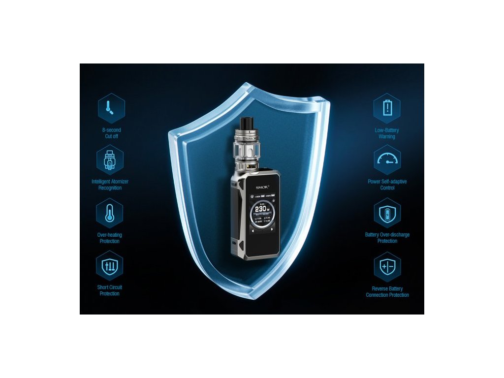 Čtvrtá řada dotykového gripu G-Priv 4 s propracovanou konstrukcí těla, která je v místě držení pokryta kůží pro pohodlný úchop. Spodní kryt umožňuje vložení dvou baterií typu 18650, které aktivují nový čip IQ-M s nejpokročilejším uživatelským rozhraním. Masivní 2,0 palcový barevný displej s vysokým rozlišením umožňuje nastavení pomocí jednoduchého dotyku. Grip nabízí regulovatelný výkon až 230W. Clearomizer TFV18 Mini je vybaven konvexní nádržkou o objemu 6,5ml, pořádným přívodem vzduchu a žhavícími hlavami typu Mesh o odporu 0,15ohm a 0,33ohm.