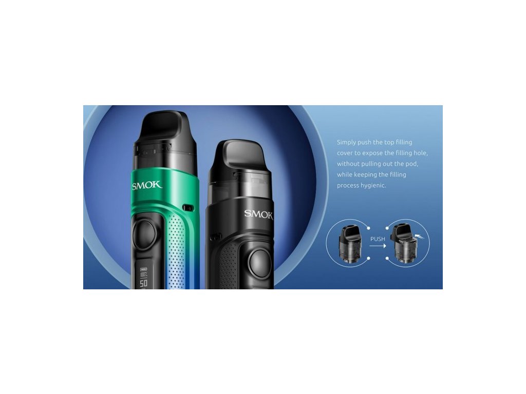 RPM vape zařízení od Smoktechu se rozrůstají o nový přírůstek s přídomkem C. Integrovaný monočlánek o kapacitě 1650mAh je uschován v ergonomickém těle baterie, jehož ozdobou je 0,69palcový OLED displej. Nastavitelný výkon až 50W Vám zaručí pořádnou tvorbu páry společně s čistou a autentickou chutí liquidu. Nabíjení zajišťuje USB-C port. Mezi jeho další přednosti patří ochrana proti zkratu, přehřátí a podbití, či osmi vteřinová ochrana žhavení. Cartridge jsou vybaveny žhavícími hlavami RPM 2, které lze jednoduše vyměnit. Uživatelsky přívětivé vrchní plnění pojme až 4ml Vašeho oblíbeného liquidu. V základním balení budete mít na výběr dvě žhavící hlavy, a to Meshed o odporu 0,16ohm a DC 0,6ohm. Regulace přívodu vzduchu pro nastavení optimální kouřivosti se nachází ve vrchní části těla baterie.