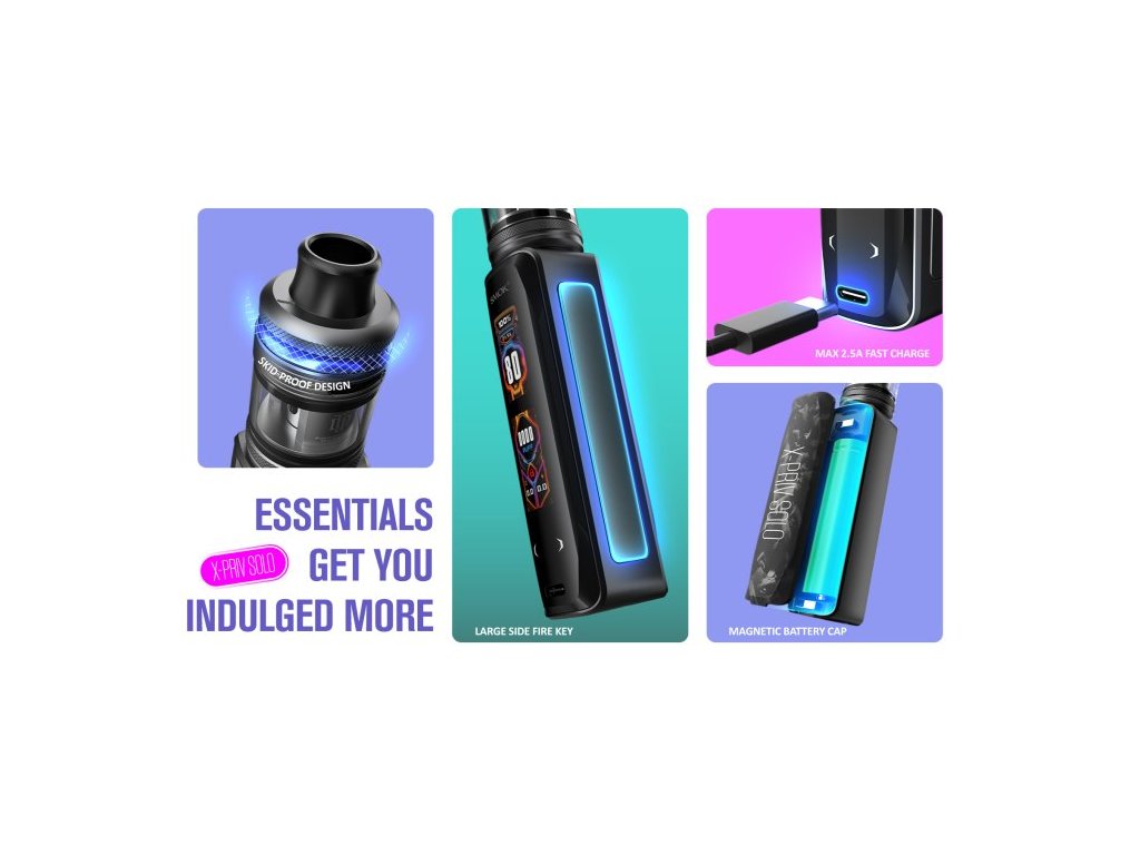 V dnešní době POD systémů nezapomíná Smoktech na milovníky pořádných mraků, a proto představuje grip X-PRIV SOLO, který dokonale spojuje styl a přenosnost v sub-ohmové kategorii. Přední panel je osazen přehledným a barevným displejem, díky kterému je nastavení zařízení jednoduchou a zábavnou záležitostí, nastavení výkonu a ovládání v menu je pomocí dotykových tlačítek na předním panelu. Po otočení o 180 stupňů se nachází pod designovým panelem s magnetickým úchytem prostor pro monočlánek typu 18650. Nastavitelný výkon 5W až 80W, pohodlné boční spínací tlačítko nebo ochrany proti zkratu, přehřátí, přežhavení a nízkému odporu jsou už jen krásnými vlastnostmi tohoto zařízení. Výrobce této sadě přidělil clearomizer TF-D SubTank s vrchním plněním a žhavícími hlavami D-COIL.