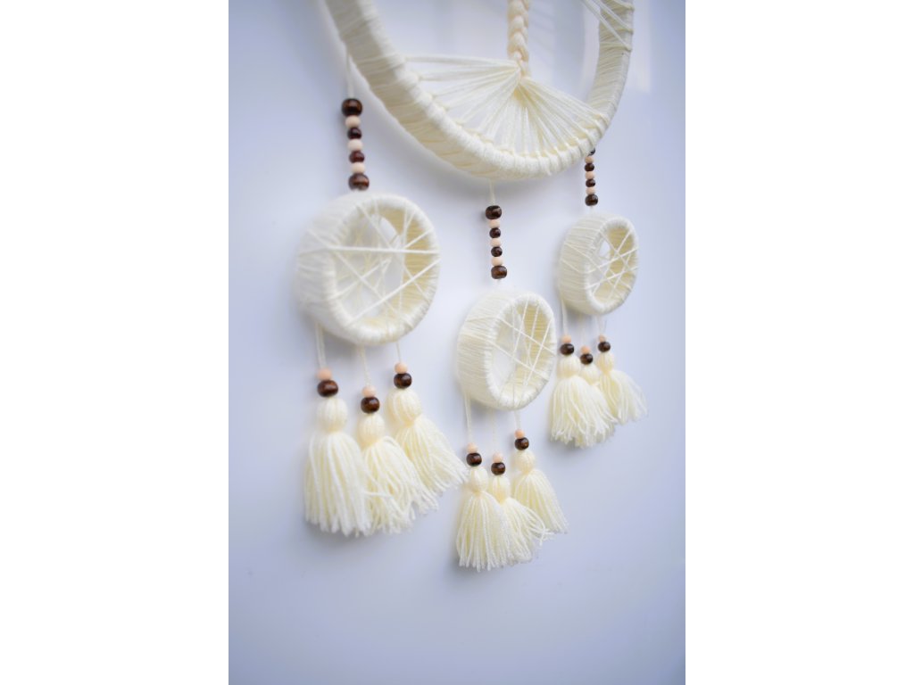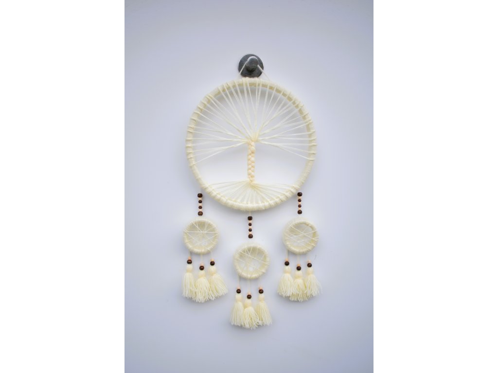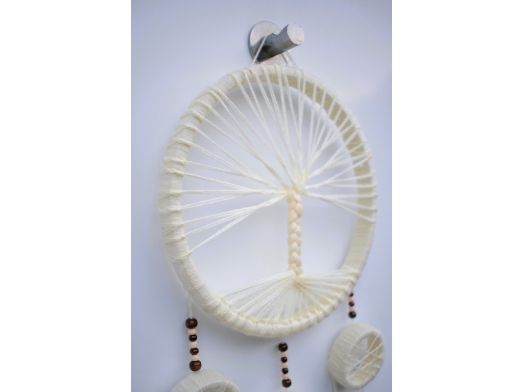 Lapač snů se smetanovými bambulkami, hnědými a světle dřevěnými korálky a třemi kolečky. Uprostřed největšího kola se nachází strom života.