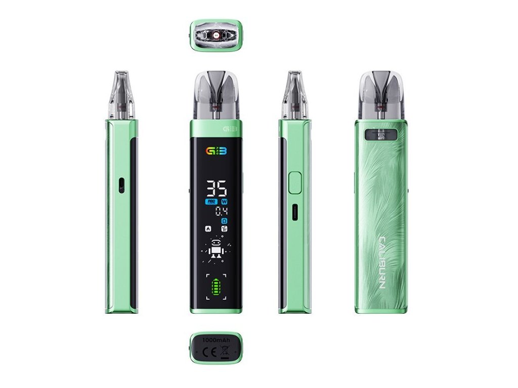 Uwell Caliburn G3 PRO se pyšní velkým barevným LCD displejem, který je umístěn po celé přední straně baterie = zobrazení všech detailů Vašeho vapingu na první pohled. Integrovaný monočlánek disponuje kapacitou 1000mAh, nastavitelným výkonem až 35W a USB-C portem pro rychlé nabití. Tvorbu páry zajišťuje spínací tlačítko nebo systém automatického žhavení - stačí pouze potáhnout z náustku. Na boční straně baterie je umístěna důmyslná regulace přívodu vzduchu zajišťující skvělou dýmivost a autentickou chuť liquidu. Cartridge G3 rozšířily svojí nabídku o novou 0,4ohm cartridge o objemu 3ml s technologií PRO-FOCS = nejlepší autentická chuť liquidu.