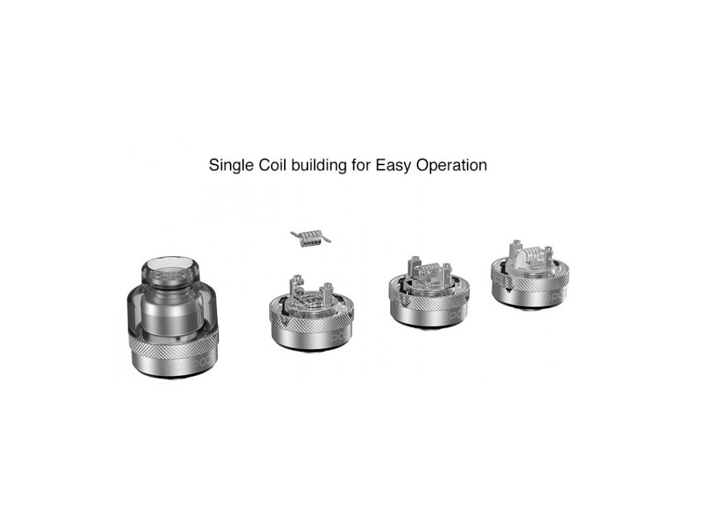 VOOPOO RTA Pod je DIY clearomizer s magnetickým konektorem, který lze použít jak na obyčejných MODech, tak i na pokročilém Drag X PODu. Systém regulace přívodu vzduchu v kombinaci se širokým náustkem Vám zajistí špičkový DL zážitek. Tělo je vyrobeno kvalitním PCTG plastem a umožňuje neustálou kontrolu nad zbývající zásobou liquidu. Jednoduchá single coil základna poskytuje dostatečný prostor pro umístění takřka libovolné spirálky, a díky přívodu e-liquidu ve stylu GTA nemusíte řešit jeho regulaci